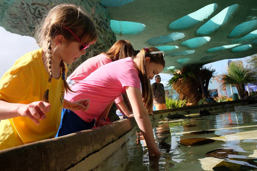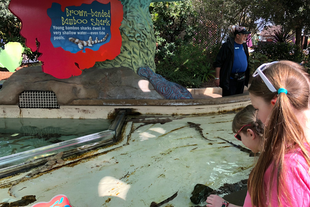 The Seaworld San Diego experience began as soon as we walked through the park gates. The kids ran to Explorers Reef – home to several species of reef shark and they had their first of many opportunities during the day to interact with the sea life at SeaWorld.