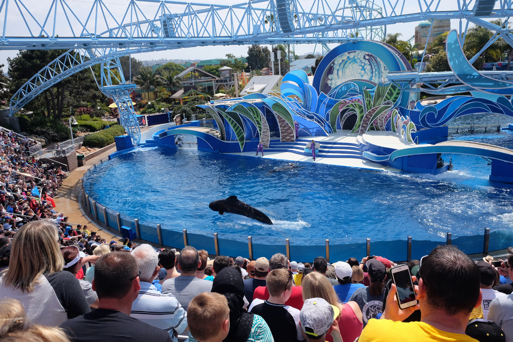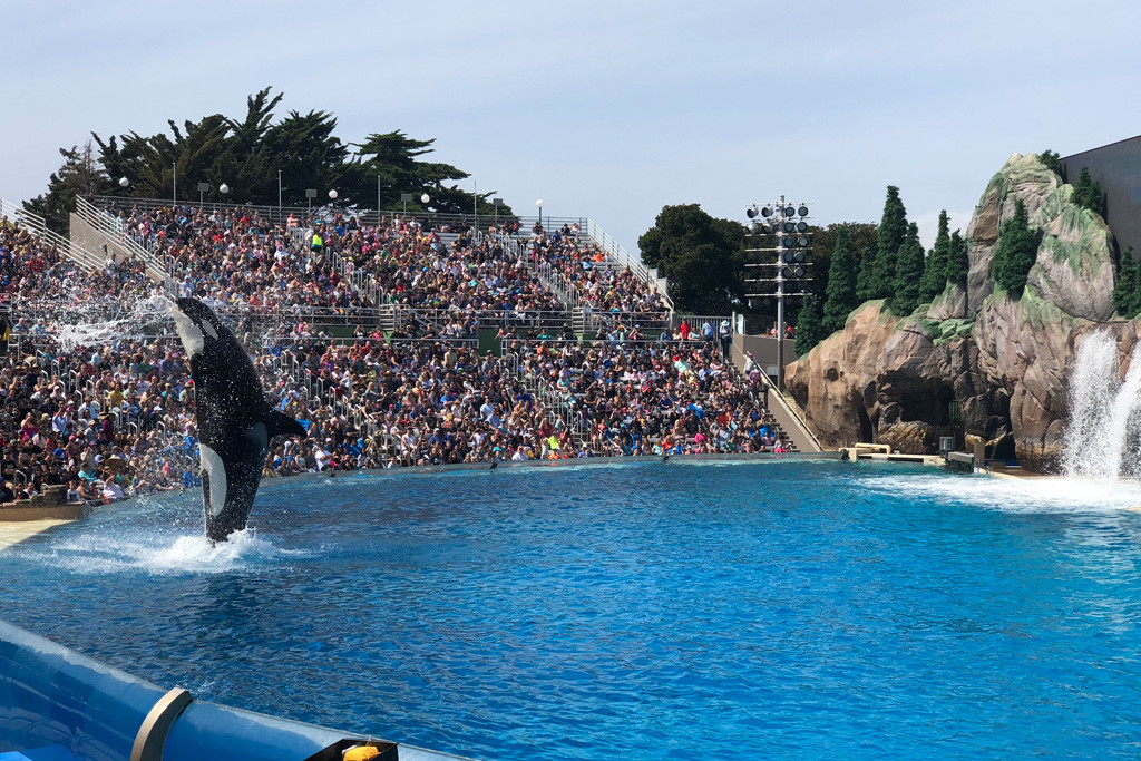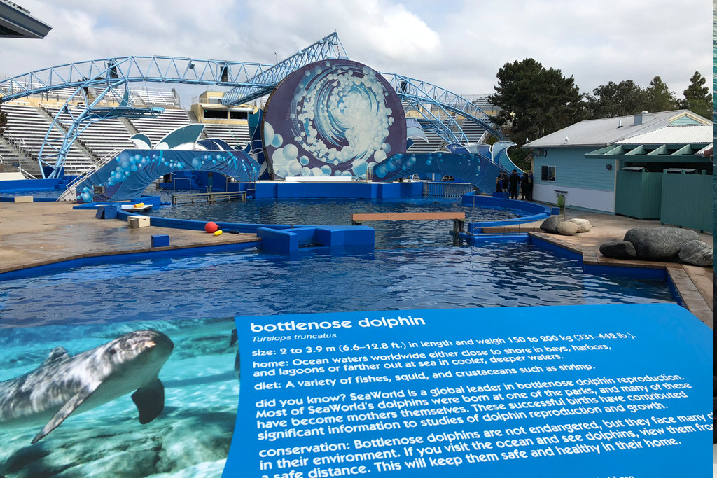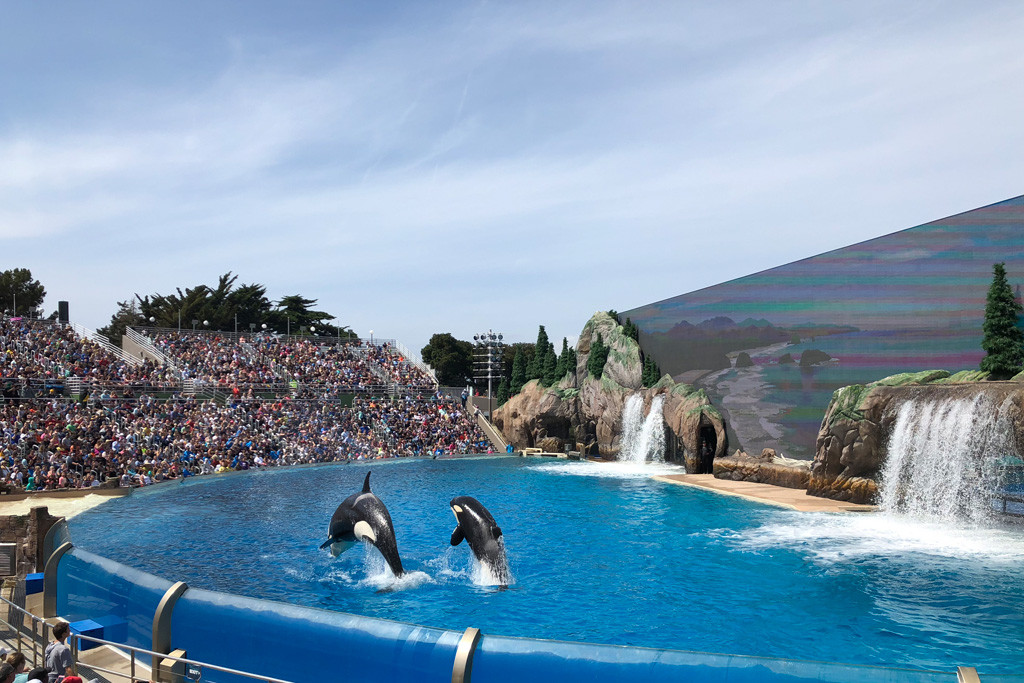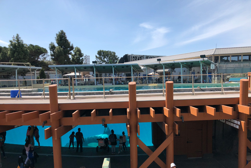 The 5,500-seater stadium curving around the 1.7 million gallon tank along with natural rocks, trees and man-made waterfalls surrounding the 138-foot high video wall it was a spectacular setting for the Orca Encounter show which has now replaced the Shamu show.