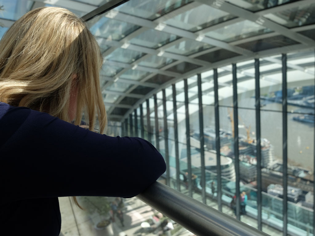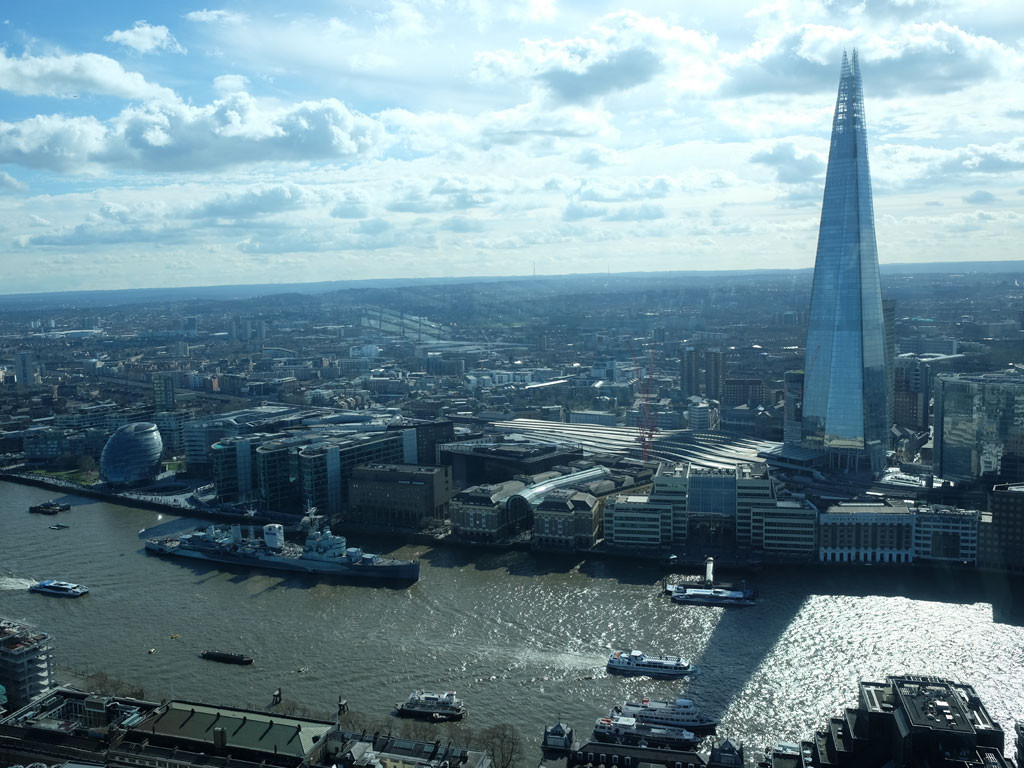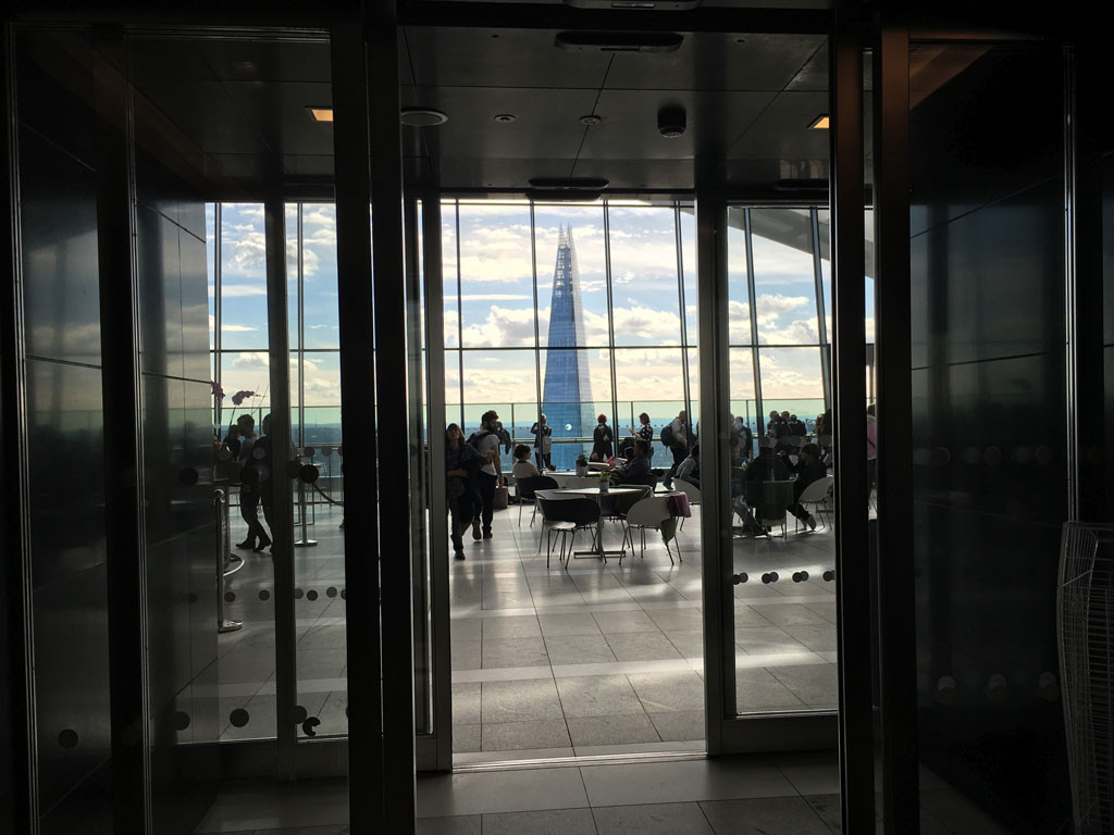 In the distance through the vast glass windows you see the skyline of London, dominated by the Shard.