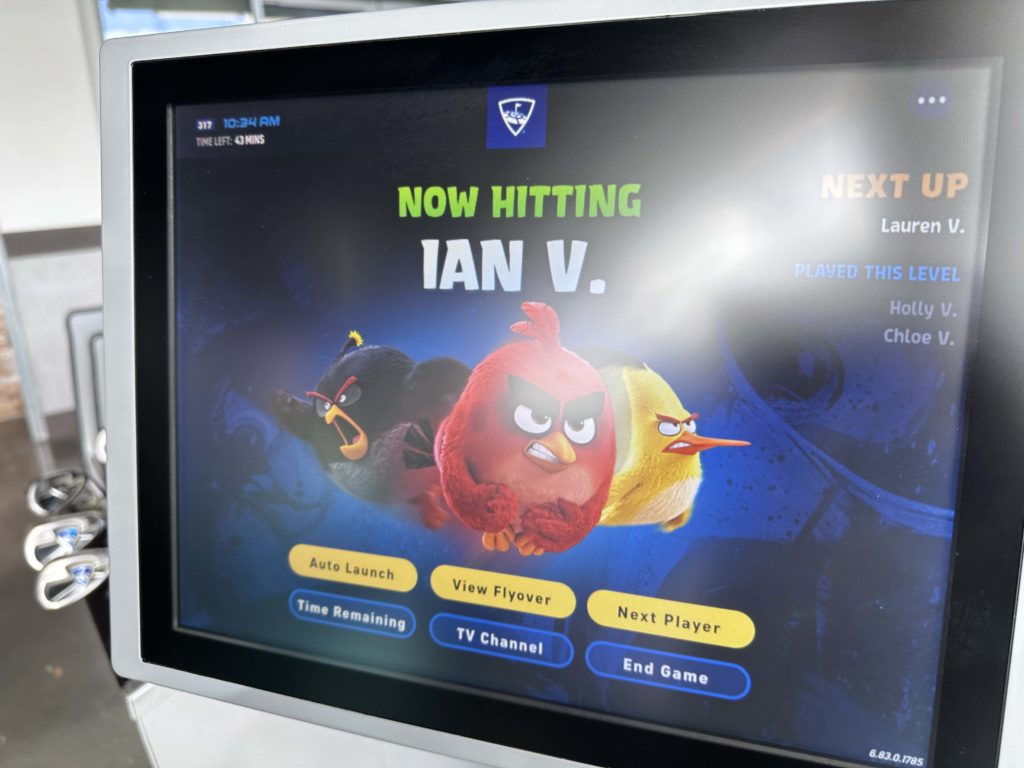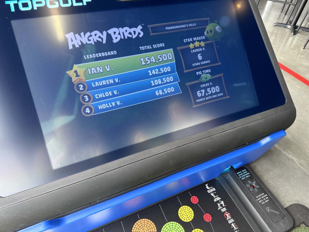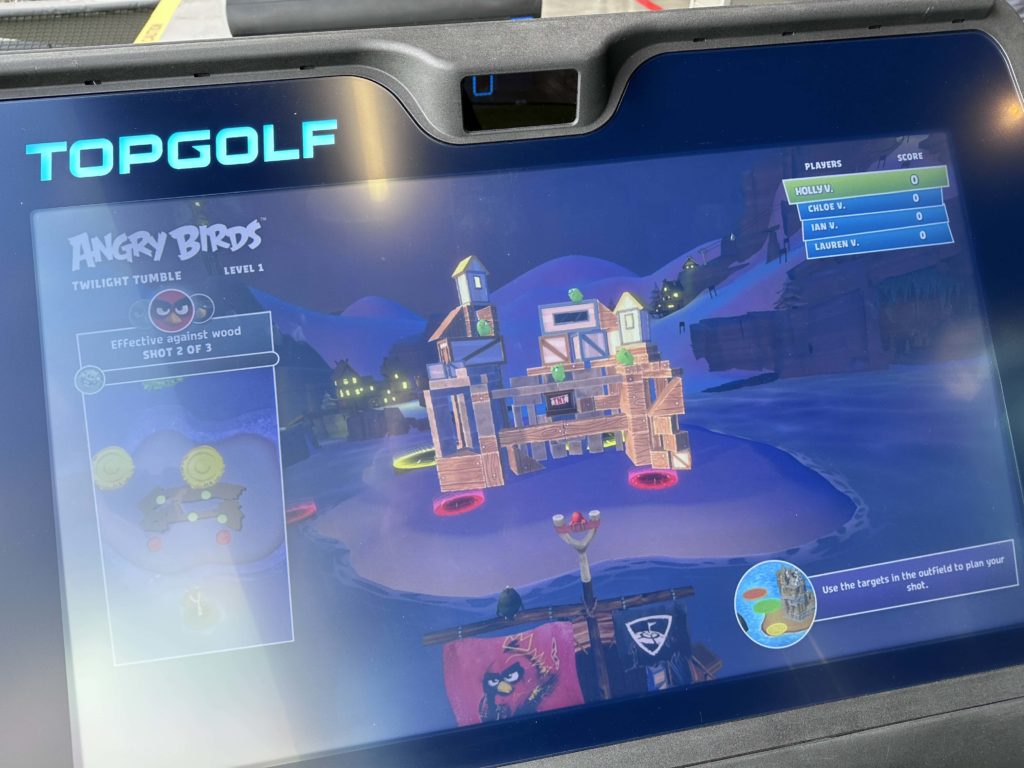 TopGolf offers a range of interactive golf-centric game options, with their most popular being their original “TopGolf” game – which is essentially driving range practice, where you score points on the enormous coloured targets scattered around the range.  We asked our host which game they would recommend and he set up their Angry Birds golfing game, which is really popular for families.