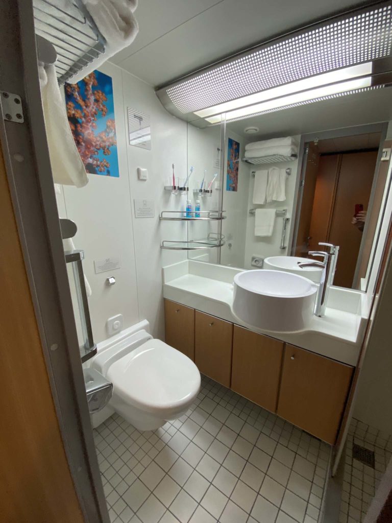 Given the significant upgrade cost per cabin for a large balcony cabin – typically £700 it would have been a welcome addition if the bathrooms had the Clarins toiletries found in the suites instead of the cheap wall mounted toiletries found in the shower cubicle.