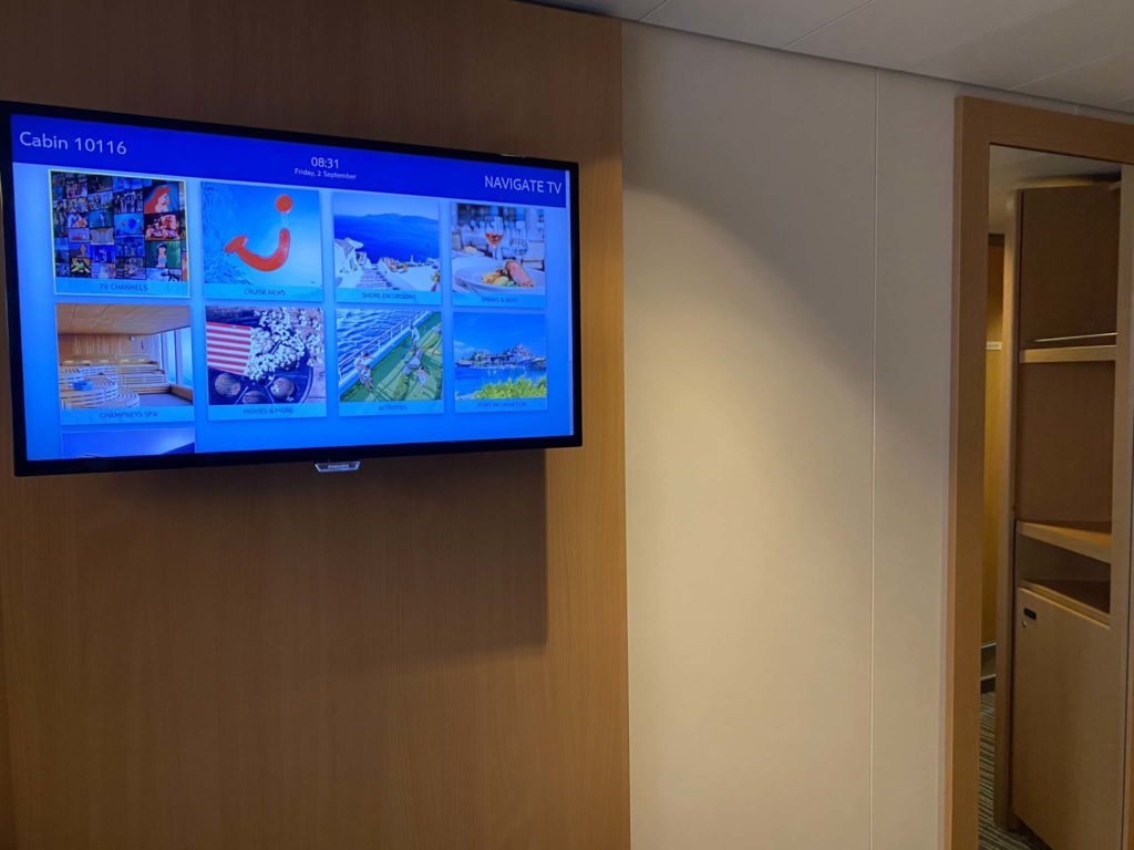 Yes, all cabins have modern flat screen TV’s, ours was interactive showing the cruise map, lots of channels and information similar to what you would find on the Navigator app.
