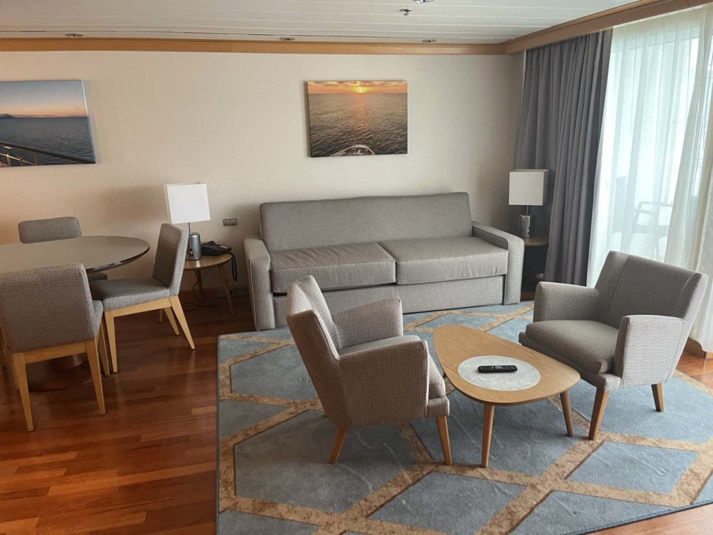 The junior suites are 22m2 and are found on deck 10 and 12 and can sleep up to three people in the twin or queen-sized bed along with a sofa bed. What makes the junior suites different to the other cabins on-board is that the bed faces the patio doors onto the large balcony.  Like the large balcony cabins, the balconies in the junior suites a fantastic, furnished with two sunbeds, coffee table and chairs and a hammock.