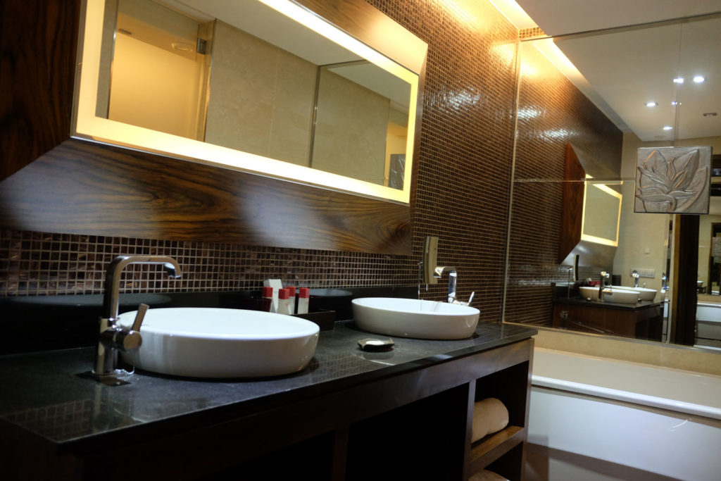 The interiors of the deluxe room are impressive, beautifully decorated with dark wood furniture and cool mood lighting above the bed. The rooms consisted of a king bed, sofa bed, small seating area and wall mounted TV and all the extras you would expect at a 5* hotel from bathrobes and slippers to evening turn down service.