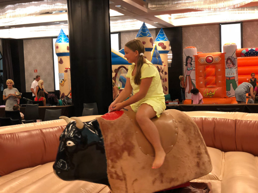 Located off the main plaza was a dedicated kids area which had games consoles, bouncy castles and a mini disco – which is always a holiday highlight for both Chloe and Holly.