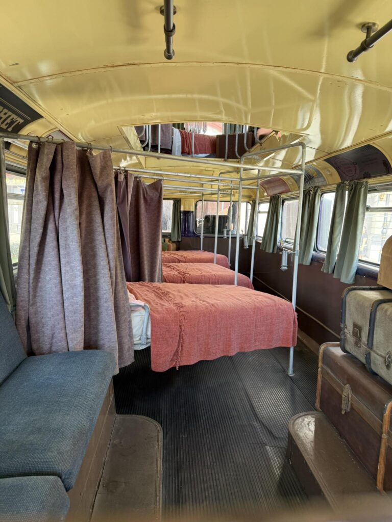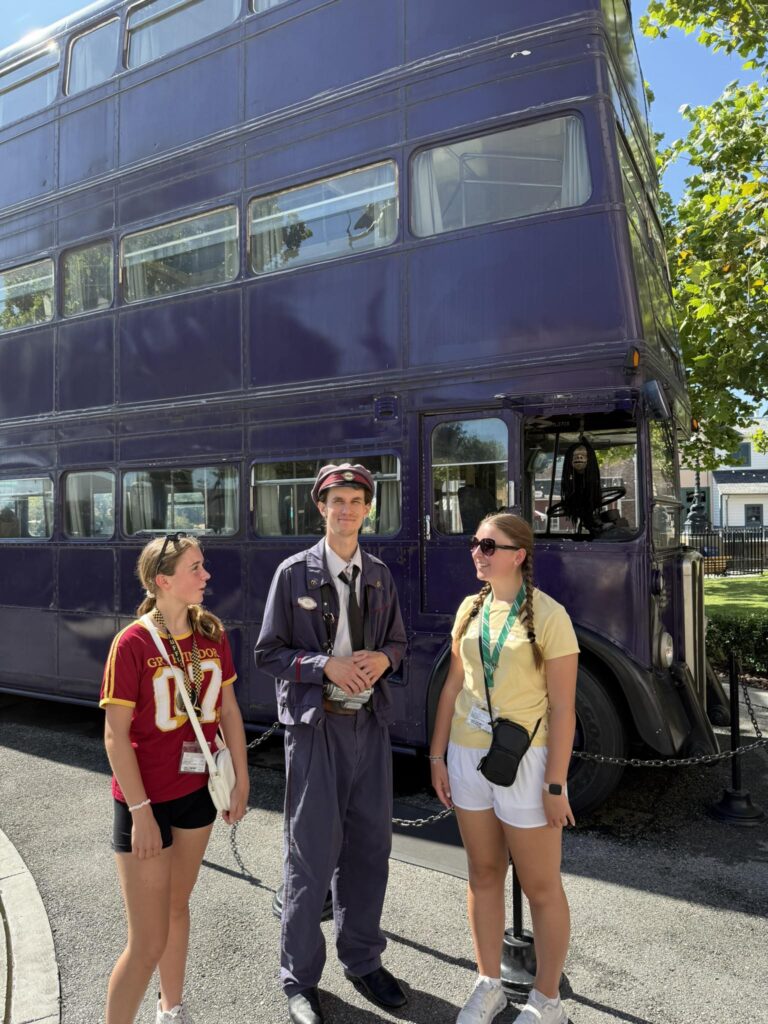 We checked out a few shops and called into the Leaky Cauldron to check out breakfast options (yes, they do include a free Butterbeer at breakfast). It was busy, and we did find staff a little less friendly than at Disney, but the theming more than made up for it. Also don’t forget to stop off at the three-storied  Knight Bus and have a chat with the conductor and the talkative shrunken head, it was so much fun.  You can even check out the back of the bus for great photo ops and see the curtains, beds, and the ornate chandelier inside.