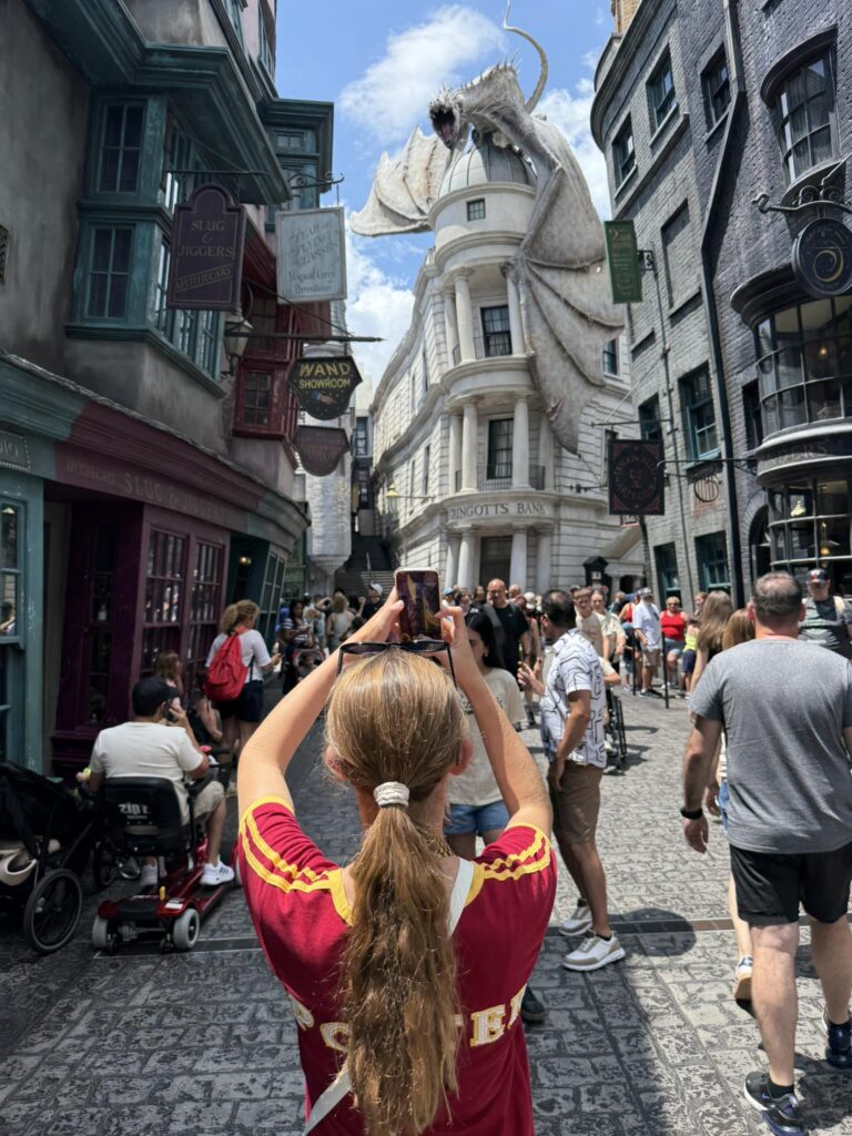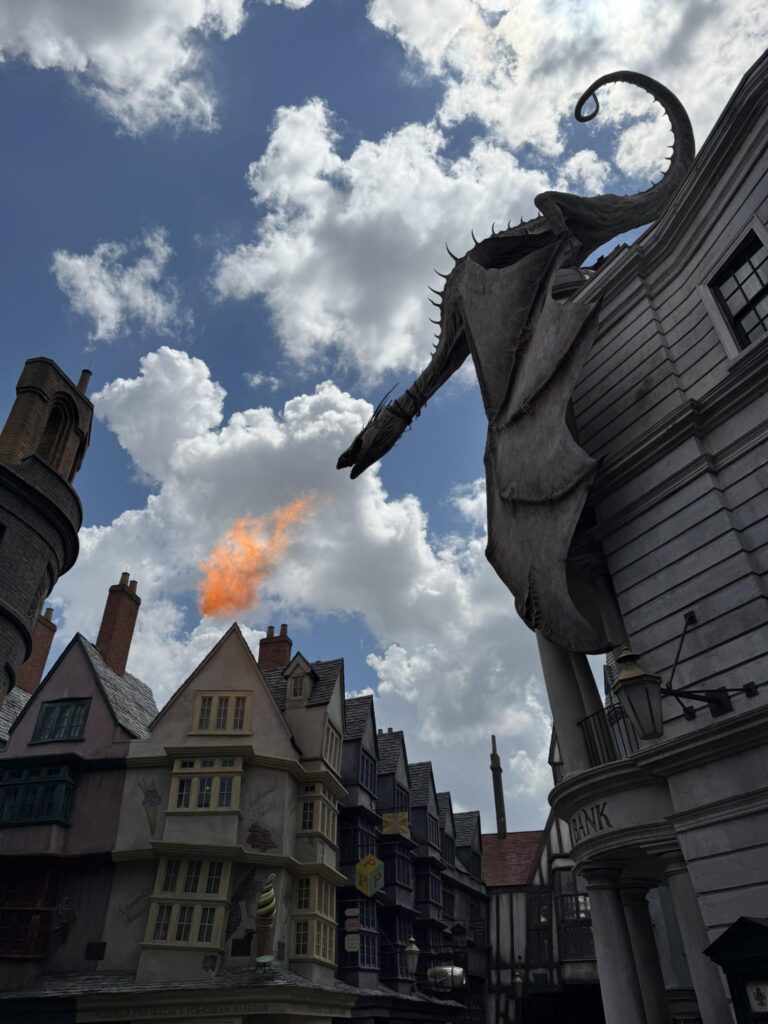 Shops line the cobbled streets, from Ollivanders to Weasleys’ Wizard Wheezes, each brimming with magical details. Above it all looms the giant dragon at the top of Gringotts Bank, who periodically roars and breathes fire — a spectacular sight that never fails to impress.