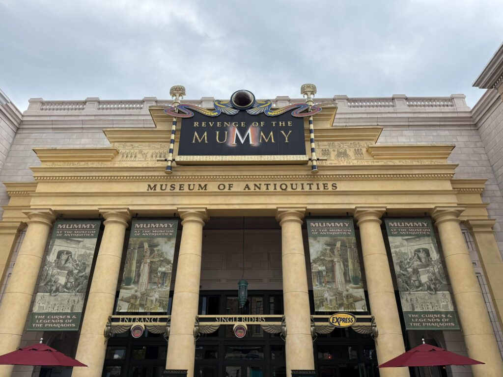 Throughout the park, we continued to see more of the Halloween Horror Nights sets and merchandise, each one looking scarier than the last. Even though it wasn’t running during our visit, it gave us a taste of just how spectacular (and terrifying) this event must be.  One coaster that we had still to experience was one of our favourites from a previous visit the Revenge of the Mummy, and as we rushed forwards and back on the track, fleeing from the evil Mummy it still remains one of the best rides here, we loved it.
