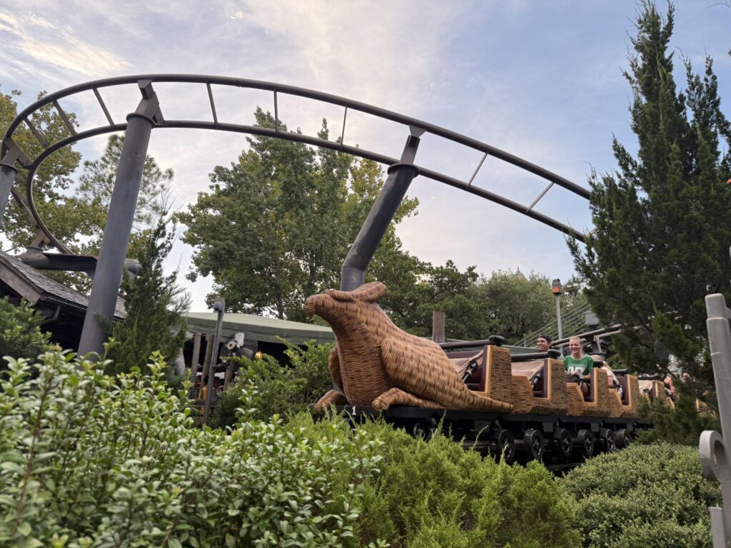 A brand-new area for us this trip was DreamWorks Land, recently reimagined from the old KidZone. We missed Shrek, Fiona, and Donkey outside Shrek’s cottage, but we did enjoy the Trolls Trollercoaster — a fun family coaster towards the park of the park.