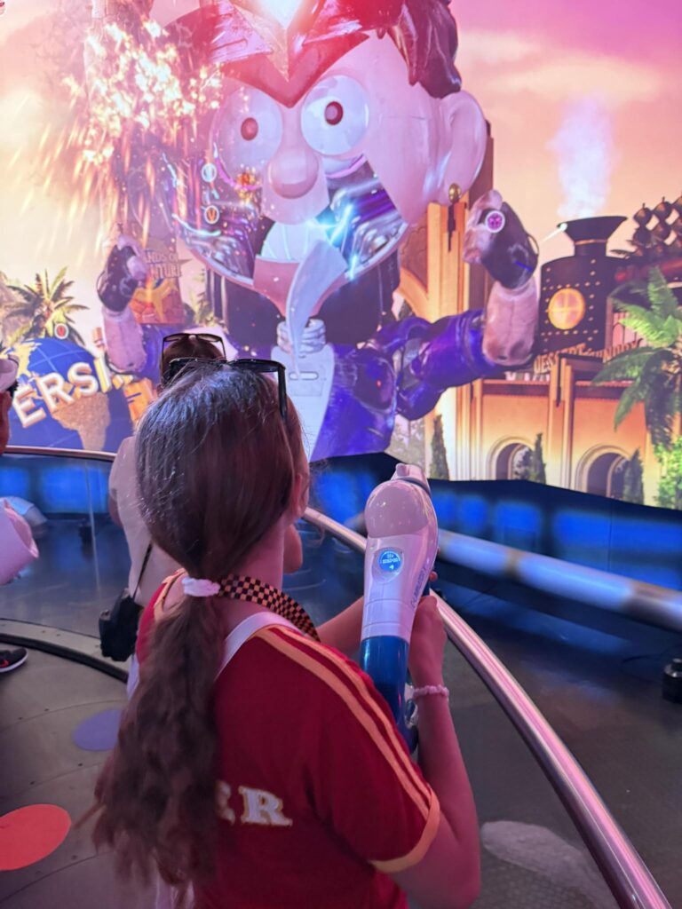 Our first stop was one of Universal’s newest attractions at this park: Illumination’s Villain-Con Minion Blast. This is nothing like anything you’ll find at Disney — an interactive moving walkway where you use a blaster to take on villains, racking up points as you go. Immediately our competitive streaks came out.