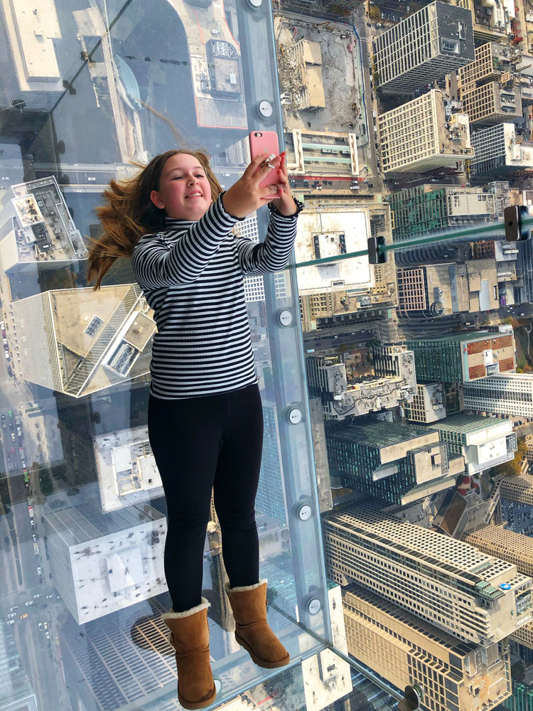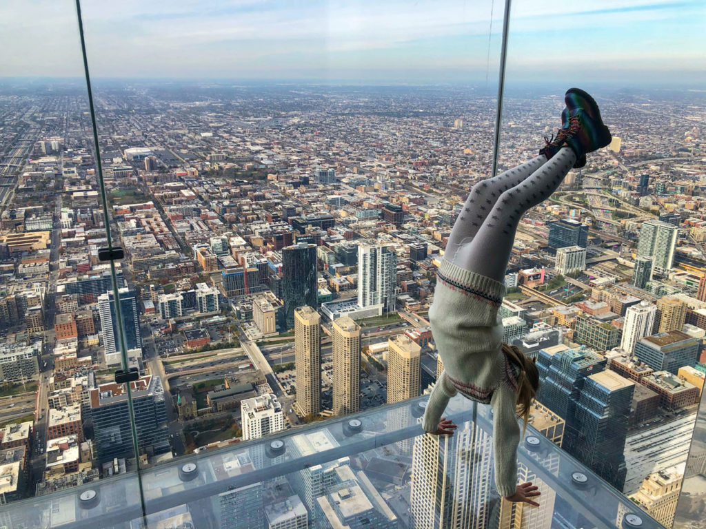 There are four 4 ft glass floor balconies 1.5 inches thick that extend 1600 feet above the city below. I was so scared but the children had no such fear, especially Holly who did a handstand! – look away if you have a fear of heights.