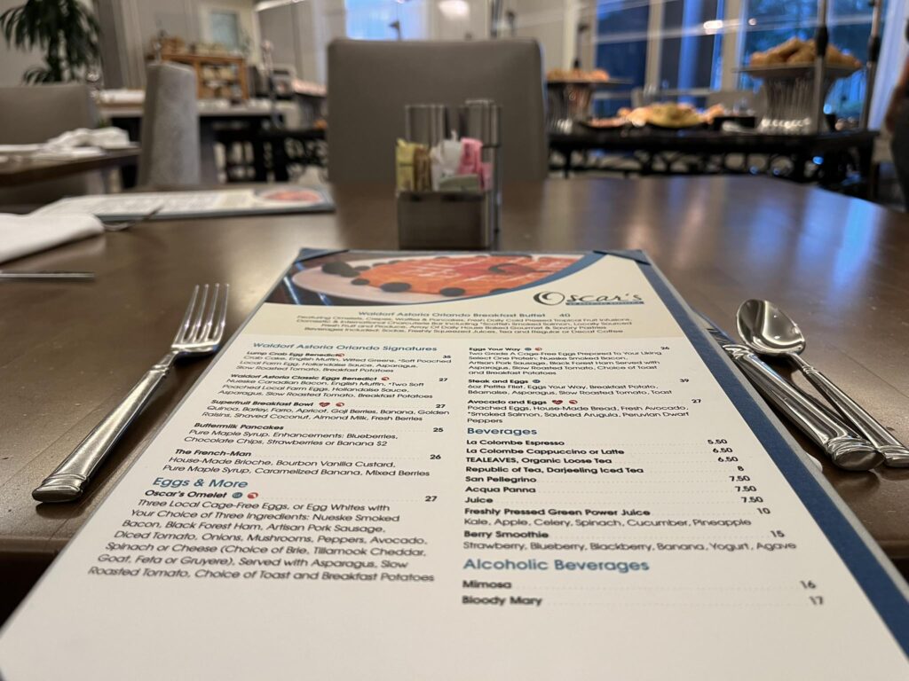 Breakfast is served each day at Oscar’s a beautiful dining room located on the ground floor of the hotel. Breakfast at the Waldorf, although expensive at $40 per adult (12+) was worth every penny and a great way to start our days when we weren’t leaving early to go to the theme parks.