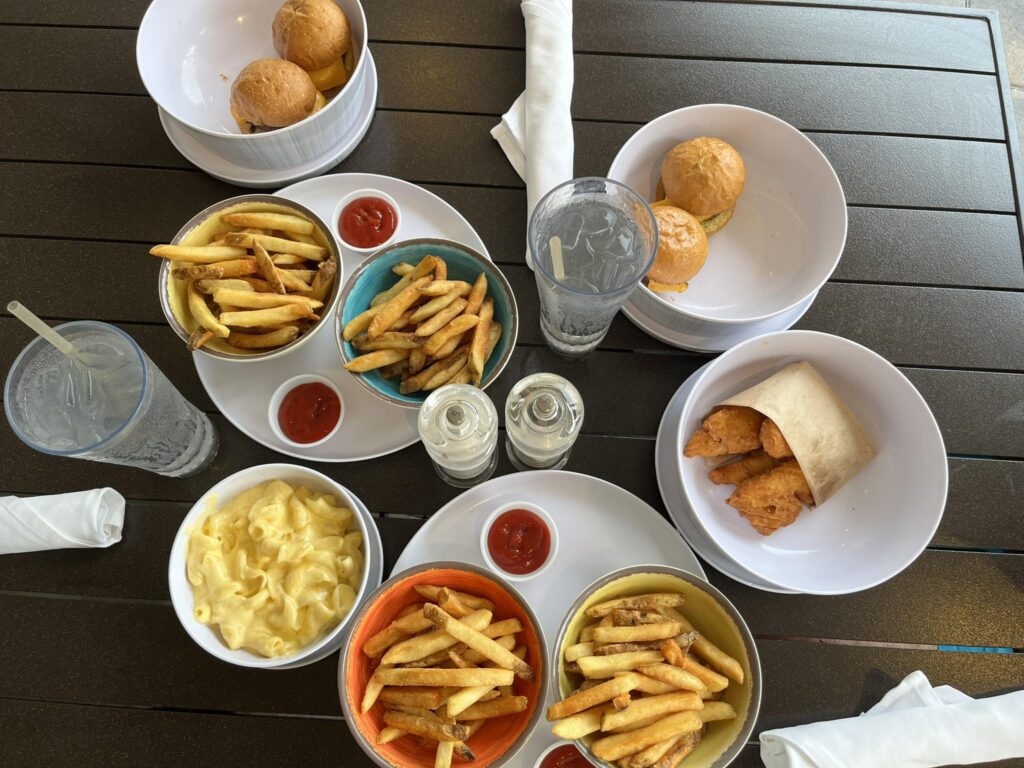 One of our favourite lunch spots at the hotel was once again Aquamarine – the casual poolside restaurant. The menu was extensive with a really good kids menu. We ordered a variety of delicious dishes, with some of our favourites being the burgers, chicken tenders, mac and cheese and pizzas and the poolside setting kept the kids happy.
