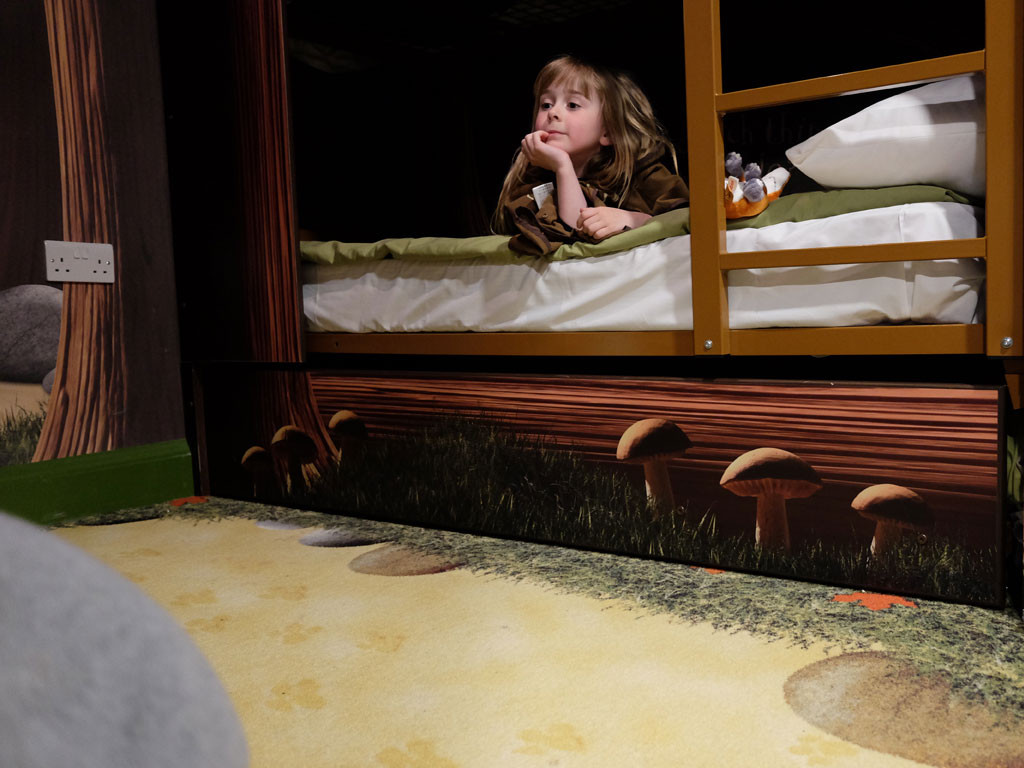 Children have their own their own personalised Gruffalo themed TV where they can watch the Gruffalo animated films from their bunk-bed treehouse section of the children’s area of the room.