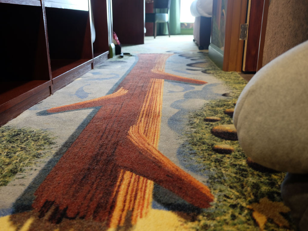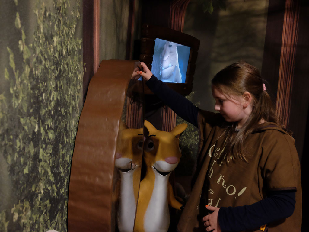 There is so much for children to explore in the room, from the hidden door behind the faux stone cushions that contained a copy of the Gruffalo book to read, Gruffalo themed narrative such as “you go ahead and I’ll follow after” that activates when you open the hotel room door to a giant wooden interactive wheel that when turned would say phrases from the animated film.