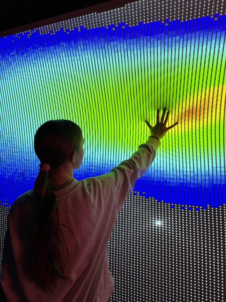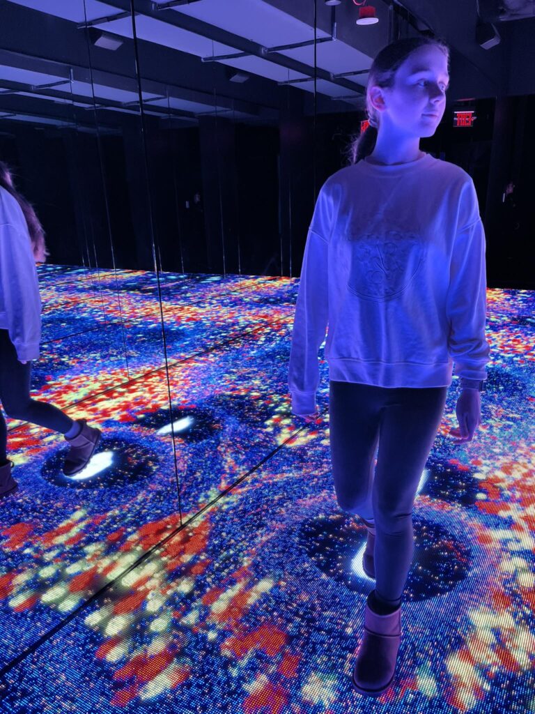 Other areas that stood out was the immersive theatre, showing projections of interactive lights on three walls and the floor along with “colour and light” where we were surrounded by every colour of the rainbow.