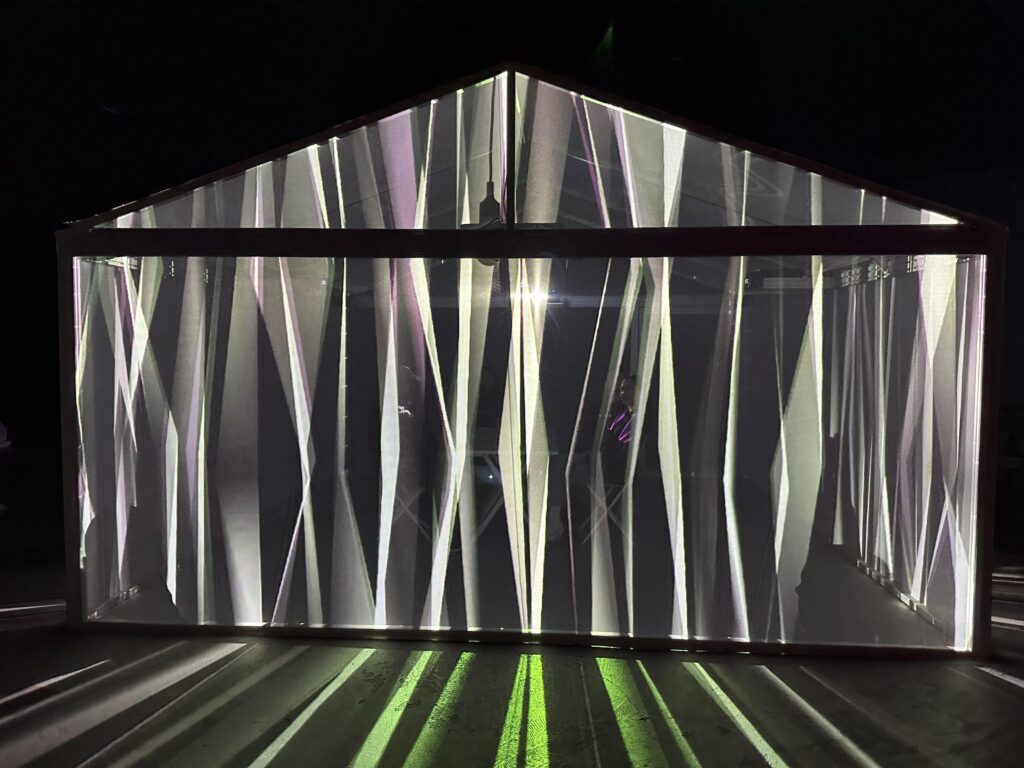 The spectacular “insideout” 360-degree video, light and sound experience by artist Leigh Sachwitz which created the feeling of sheltering in a garden shed during a thunderstorm in Glasgow, Scotland.