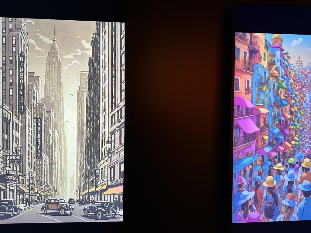 There was also really cool innovative AI technology on display here and in particular the “Untitled, by You” exhibit. This allows visitors to use text based descriptions using an AI program called Stable Diffusion, to create a unique gallery of the vision that we entered at the text prompt.